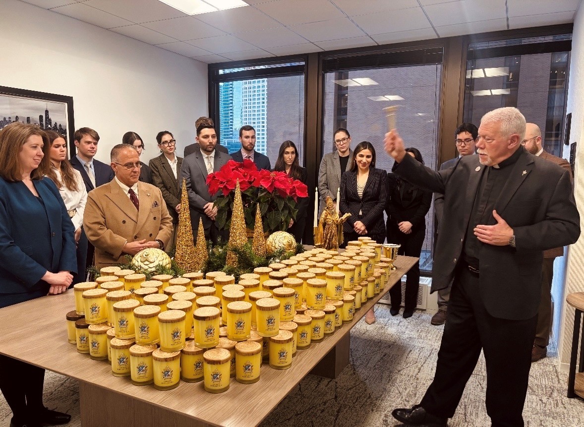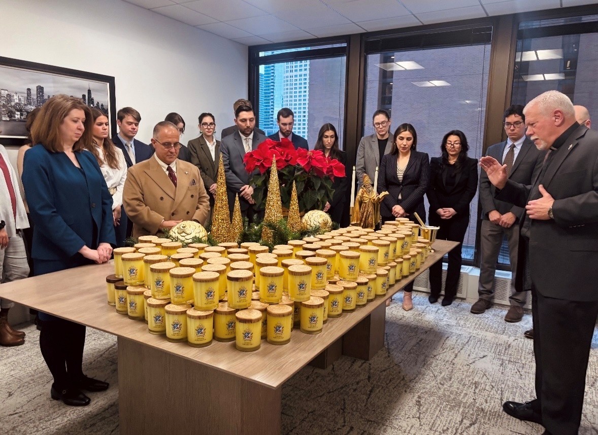 Father Tony presided over the “blessing of candles” in our office. Each candle bears the Coat of Arms and Motto of Pope Leo XIV, who, himself served as the Augustinian Prior Provincial as then-Father Rober Francis Prevost. The Holy Father’s Coat of Arms serves as a visible reminder of the values of service, unity, and hope that inspire our work throughout the year. We will be sharing these blessed candles with our clients during the Christmas season as a sign of light and warmth during days that are dark and cold.