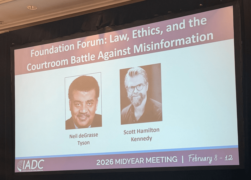 On Monday at the IADC Midyear Meeting, Michael A. Airdo led the IADC Foundation Forum, “Law, Ethics, and the Courtroom Battle Against Misinformation: A Cinematic CLE Experience,” alongside Academy Award–nominated filmmaker Scott Hamilton Kennedy and renowned astrophysicist and science educator Neil deGrasse Tyson.