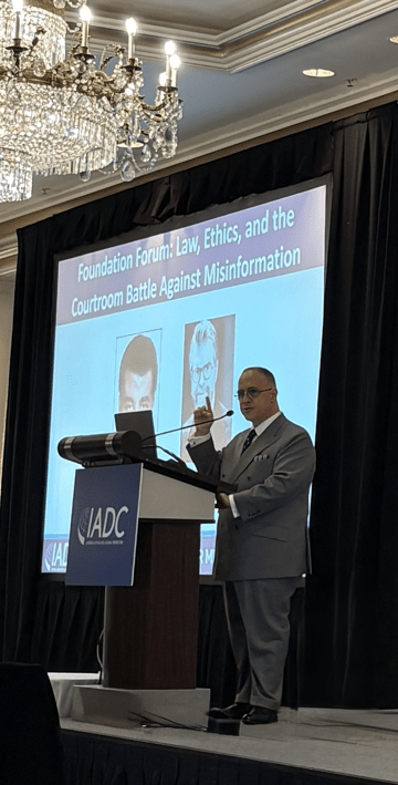 Michael, in his role as IADC Foundation Board President and a trial attorney, highlighted how misinformation erodes the rule of law and challenges the legal profession to respond not only persuasively, but ethically to misinformation. The discussion emphasized the responsibility of defense counsel to balance advocacy with integrity while addressing the realities of modern social media influence and pretrial narratives.